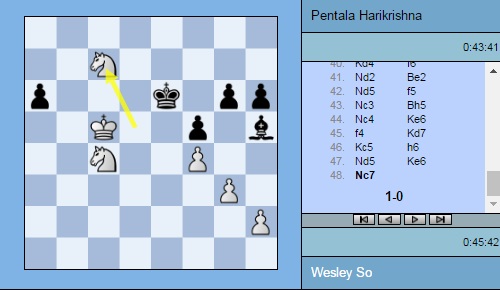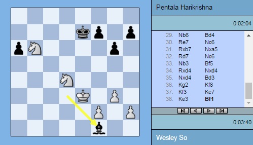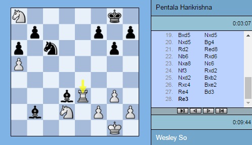 Харикришна выровнял положение в партии с Со. У американца небольшое материальное преимущество — ладья против легкой фигуры, но у индийца лишняя пешка. Комментаторы сходятся на том, что скорее всего будет ничейный исход.
