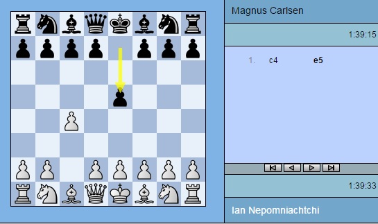 Непомнящий и Карякин разыграли английское начало, причем российский шахматист задумался уже после первого хода Карлсена. Хотя ответ е5 не является неожиданным.