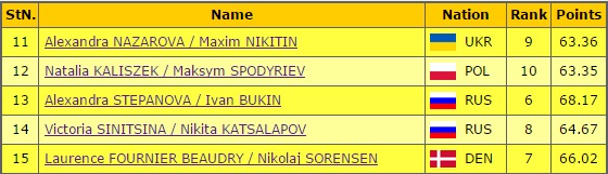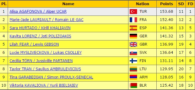10 из 20 пар откатали свои произвольные программы. Вот так выглядит предварительная турнирная таблица: