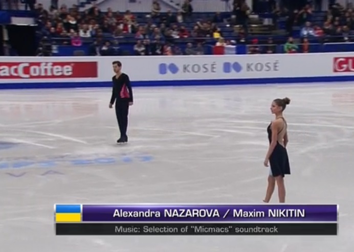 Закончилась разминка, и первым на лед после перерыва выходит украинский дуэт Александра Назарова и Максим Никитин.