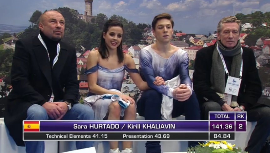 На льду представители Испании Сара Уртадо и Кирилл Халявин. Они занимают предварительное 13-е место.