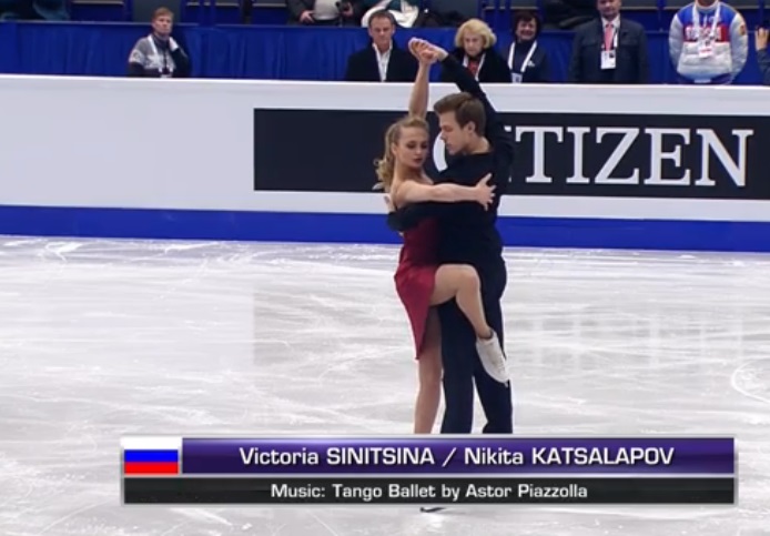 Танго танцуют российские фигуристы. Темп выступления постепенно нарастает.