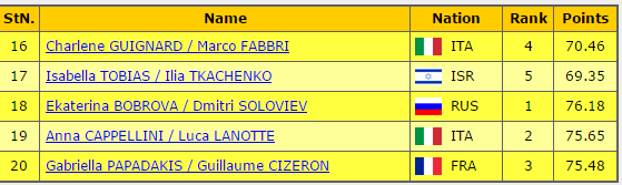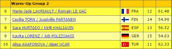 Таким образом, в последнюю разминку попала только ведущая российская пара, а две другие будут выступать в предпоследней. Помимо тройки лидеров, в сильнейшей разминке будут Изабелла Тобиас и Иван Ткаченко из Израиля (69,35 балла), а также второй итальянский дуэт — Шарлен Гиньяр и Марко Фаббри (70,46).