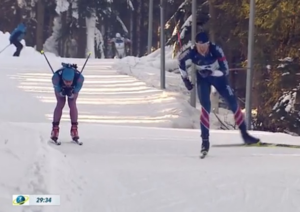 На отметке 4,6 км Расторгуев идет быстрее Логинова. Между спортсменами сейчас 15 секунд.
