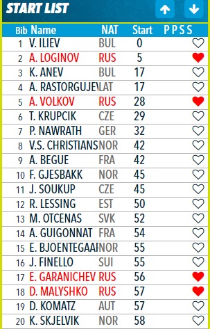 В бой сегодня уйдут сразу семеро россиян: Александр Логинов (2-й стартовый номер), Алексей Волков (5-й), Евгений Гараничев (17-й), Дмитрий Малышко (18-й), Петр Пащенко (24-й), Алексей Слепов (40-й), Юрий Шопин (41-й).