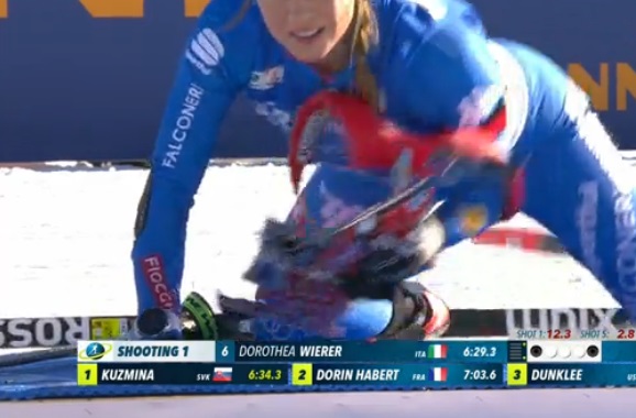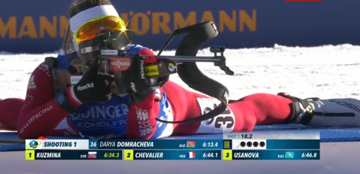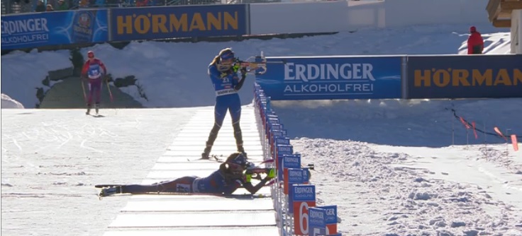Первые стартовавшие уже стреляют лежа. У Дорен-Абер — промах. Будет бежать штрафной круг.