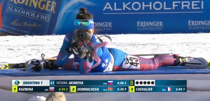После первой стрельбы Акимова идет по третьему результату. 6,3 сек уступает она давно финишировавшей Кузьминой в виртуальном соперничестве.