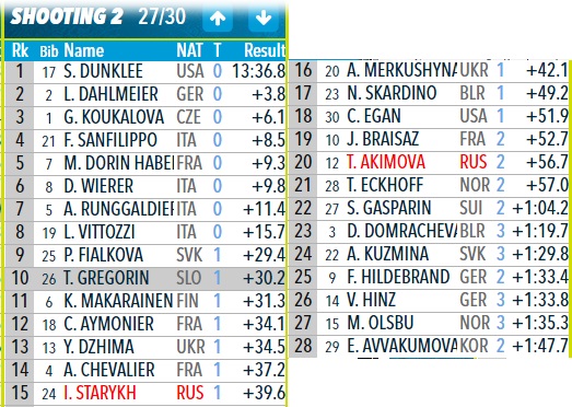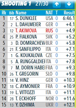 А вот Татьяна Акимова только 23-я. Почти три минуты проигрыш. Пять промахов. И это очень много.