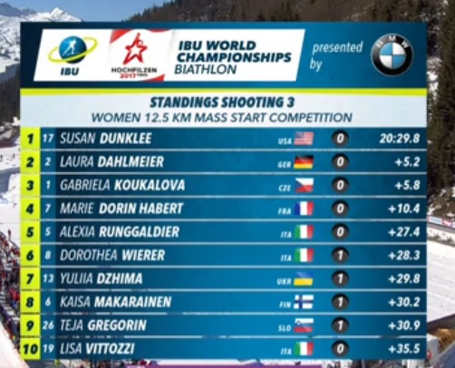 Dunklee ahead of Dahlmeier and Akimova after the first shooting #hochfilzen2017 pic.twitter.com/hzR8AnF7UF