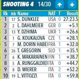 Догнали Данкли чешка Габриэла Коукалова, немка Лаура Дальмайер и француженка Мари Дорен-Абер. Вчетвером они подойдут к заключительному огневому рубежу.