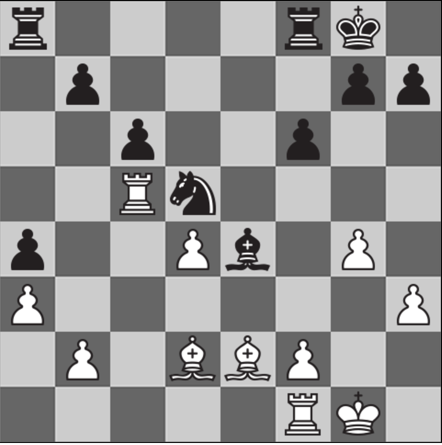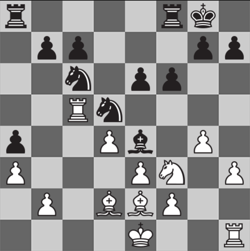 Теперь долго продумал Карякин и решил в итоге упростить позицию разменами. У Каспаров есть преимущество двух слонов, но у черных очень сильный конь на d5, который очень сильно ограничивает потенциально мощного чернопольного слона белых.