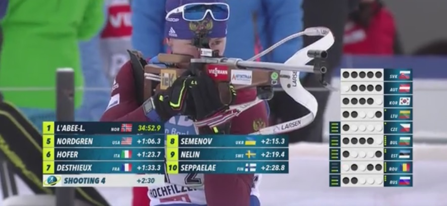 Что покажет Елисеев... Промахивается двумя первыми же выстрелами. Так... Закрыл мишени дополнительными патронами. Штрафного круга не будет, зато есть проигрыш лидеру более 2 минут.