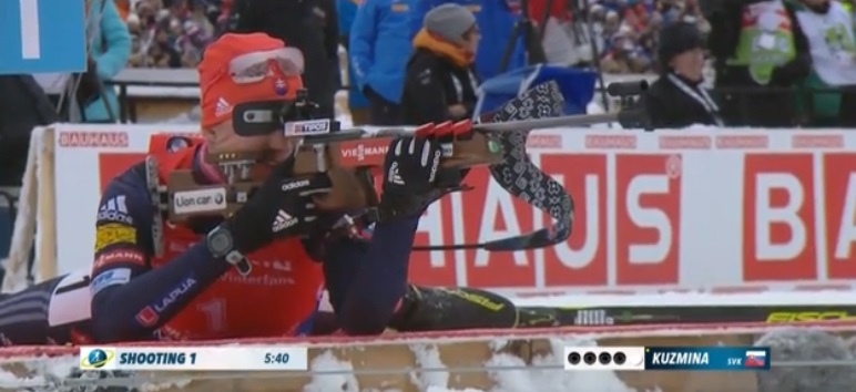 Уже вторую стрельбу проходит авангард гонки. Дальмайер и здесь вне конкуренции. А Кузьмина подтянулась после своих штрафных кругов.