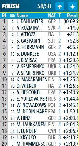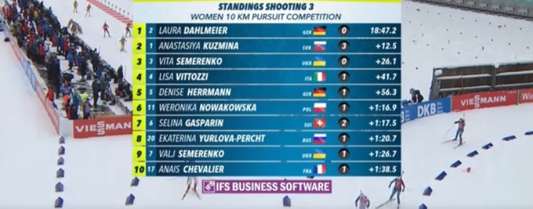 It's for Laura Dahlmeier in her favourite discipline after yesterday. Anastasia Kuzmina comes 2nd and @lisa_vittozzi gets first podium of the season #ALGB17 pic.twitter.com/uVzCS0CxuJ