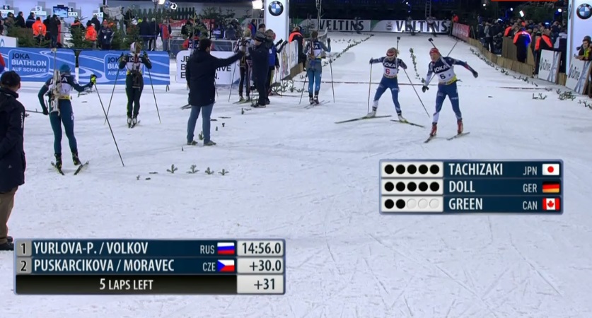 Приветствуем вас на биатлонной Рождественской гонке! Совсем чуть-чуть осталось до начала пасьюта, в котором россияне Юрлова и Волков уйдут лидерами с очень приличным запасом почти в минуту.