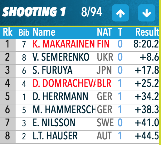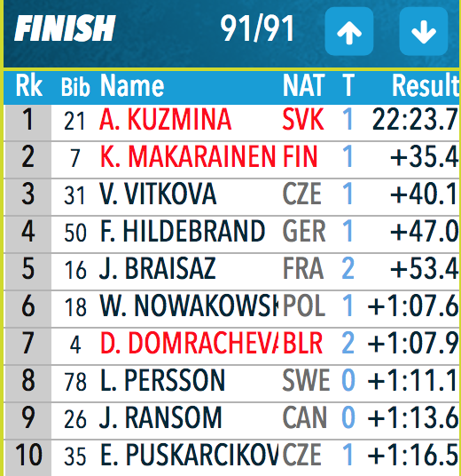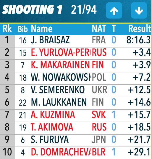 А вот Мякяряйнен точна и опережает Домрачеву на 17,8 секунды.
