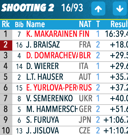 А Фролина, выступающая за Корею, опередила на финише Юрлову на три секунды и пока восьмая с таким же количеством промахов, что и Юрлова.