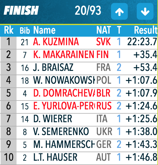 1. Кузьмина — 22:23,7 2. Мякяряйнен — +35,4 3. Виткова — +40,1