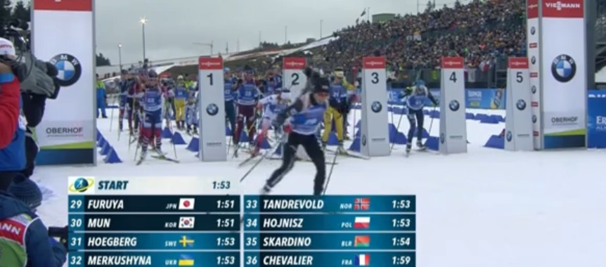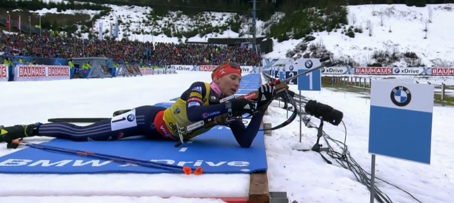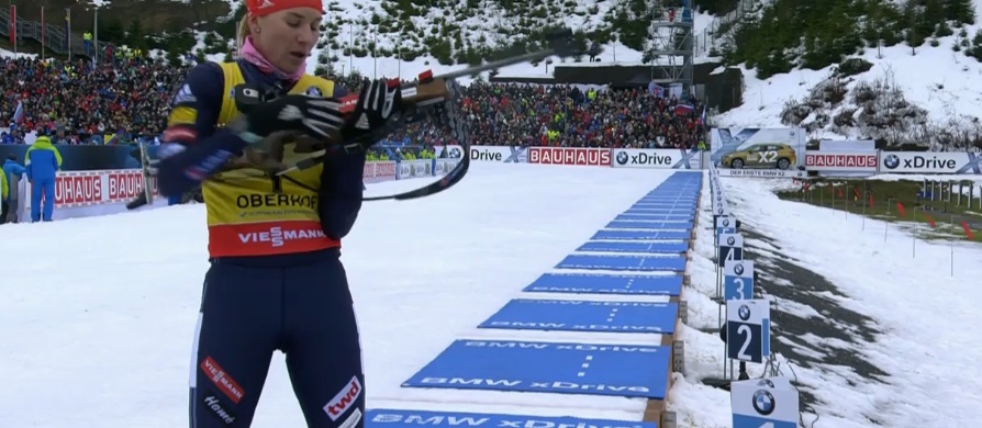 Остальные подтянулись — и мажет Хильдебранд. Домрачева тоже. Таким образом Вирер из Италии и Вита Семеренко с Украины выходят на второе и третье места.