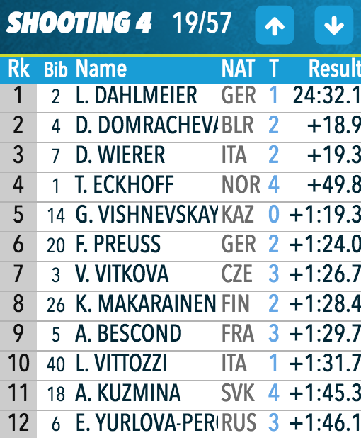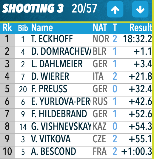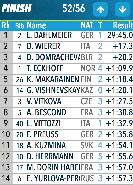 Далее Дальмайер (+12 секунд), Виткова (+21), Домрачева (+23), Бескон (+27), Юрлова (+39).