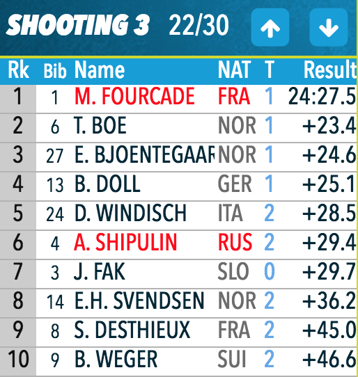 Фуркад уже обеспечил себе возможность один раз промахнуться на последнем рубеже. Шипулин шестой, но от второго места отстает на пять секунд. Все решит стрельба. Йоханнес, точно отстрелявшись, подтянулся на 14-е место. Логинов — 18-й, Бабиков — 23-й.