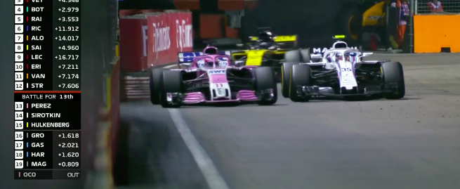Вот это момент! Перес пошел в жесткую атаку на Сироткина и почти его обогнал, но россиянин удержался! Мексиканец в итоге толкнул россиянина в борт, полетели какие-то обломки. Ну, если за такой не закажут Переса, то будет странно...