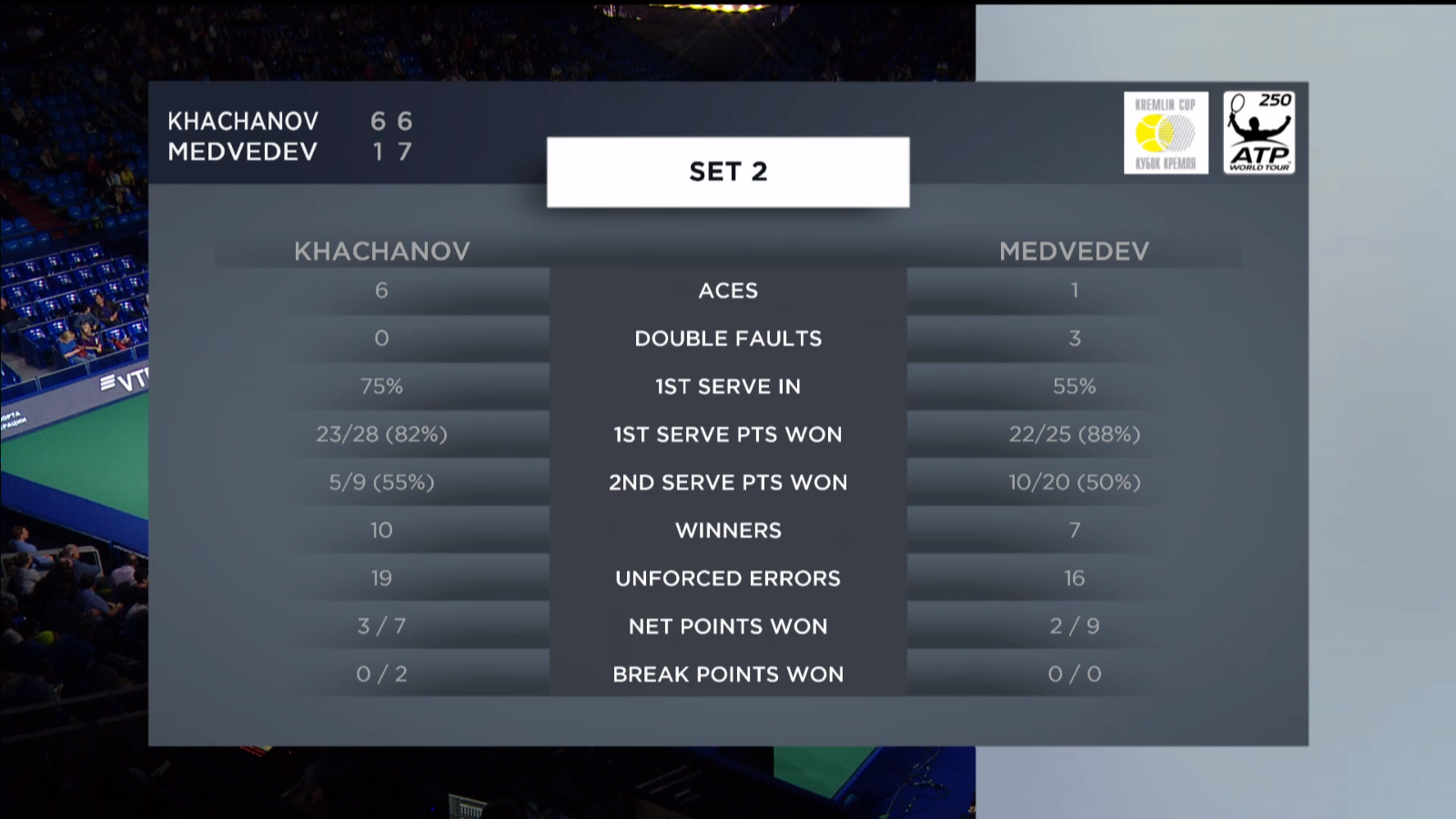 Выигрывает гейм Хачанов после того, как Медведев попадает в сетку. Швырнул ракетку со злости Даниил и сразу же получил предупреждение от судьи с вышки. 5-2.