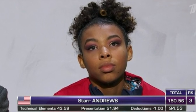 Следующая на льду американка Старр Эндрюс. 17-летняя спортсменка выступает в ярком бордовом платье со стразами.