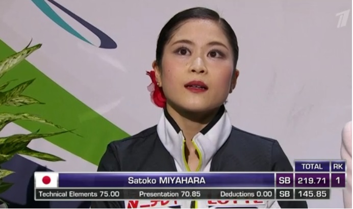 Сейчас решится судьба первого места. Выступает 20-летняя японка Сатоко Мияхара. Она была лучшей после короткой программы.