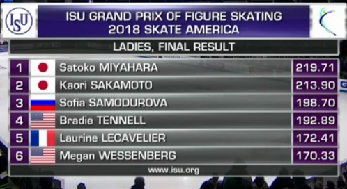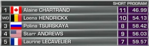 1. Сатоко Мияхара (Япония) — 219,71 2. Каори Сакамото (Япония) — 213,90 3. Софья Самодурова (Россия) – 198,70 4. Брэди Теннелл (США) – 192,89 5. Лорин Лекавалье (Франция) – 172,41 6. Меган Вессенберг (США) – 170,33 7. Полина Цурская (Россия) – 159,45 8. Марин Хонда (Япония) – 158,04 9. Элейн Шартран (Канада) – 155,49 10. Старр Эндрюс (США) – 150,56