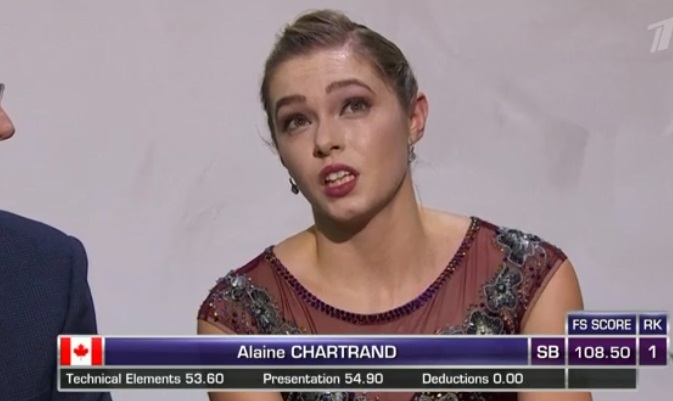 Не очень хорошие прыжки, зато без падений. 108 с половиной балла набирает канадка.