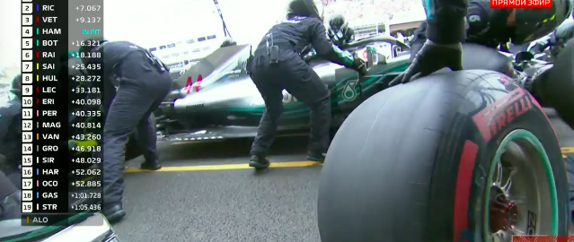 Хэмилтон остановился на питлейн и заменил шины! Теперь британец — четвертый, а его соперник за чемпионство (пусть и довольно номинальный) Феттель из «Феррари» теперь второй. Сразу же вслед за ним Хэмилтоном в боксы заехал его напарник по «Мерседесу» Боттас — синхронный питстоп.