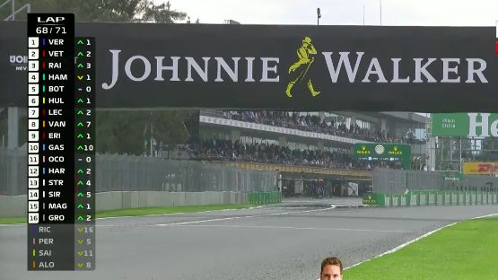 Риккардо тем временем навязывает серьезную борьбу Хэмилтону за второе место — между ними чуть больше секунды. Самого Риккардо нагоняет Феттель (между ними +1,2 секунды).