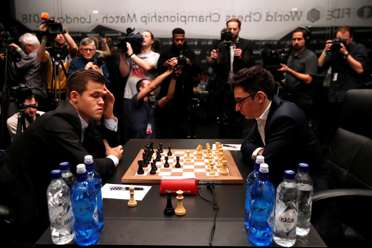 Магнус Карлсен (слева) и Фабиано Каруана в матче за мировую шахматную корону