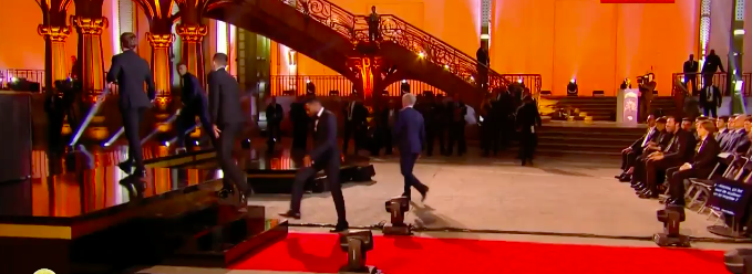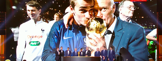 На сцену поднимается компания представителей сборной Франции, которая победила на чемпионате мира — 2018: там Гризманн, Мбаппе, Лукас Эрнандес, ну и, конечно, главный тренер Дидье Дешам.