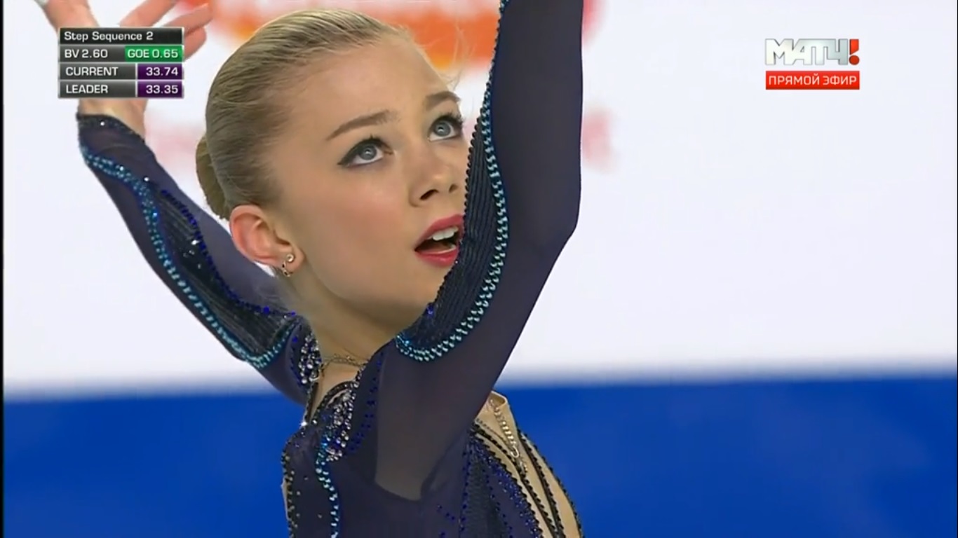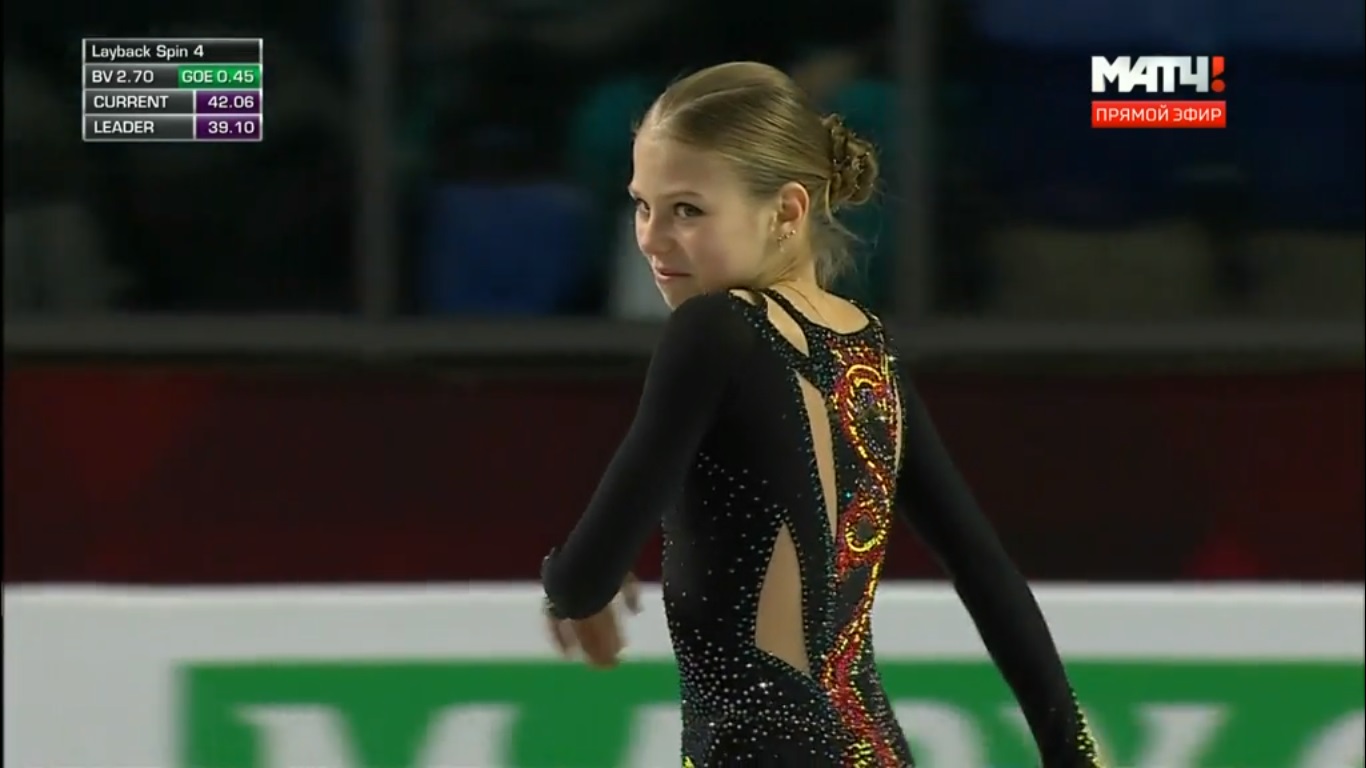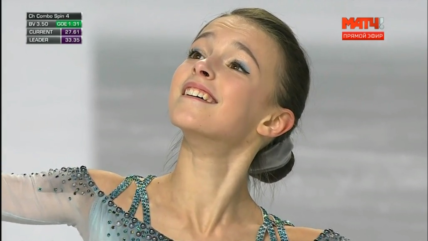 А вот и конкуренция! Тоже начала с «разминочного» обязательного в этом сезоне для юниорок двойного акселя на хороший плюс и пошла штамповать элементы. Все прыжки, включая каскад, выполнила на плюсы, а дорожки и вращения, естественно, получили четвертый уровень. По технике Алена опережает Трусову!!!