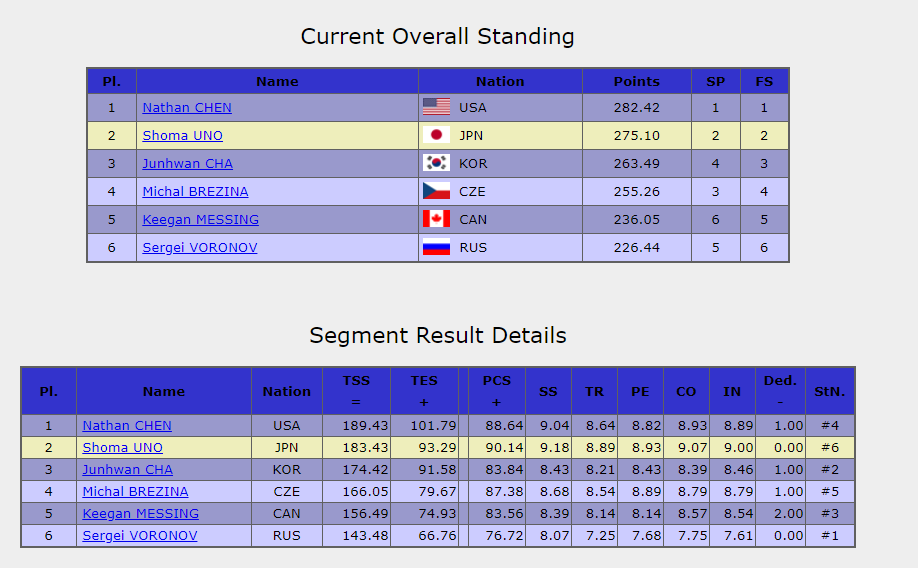 Напомним положение у мужчин после короткой программы: 1. Нэтан Чен (США) – 92.99 2. Шома Уно (Япония) – 91.67 3. Михал Бржезина (Чехия) – 89.21 4. Чха Чжун Хван (Южная Корея) – 89.07 5. Сергей Воронов (Россия) – 82.96 6. Киган Мессинг (Канада) – 79.56