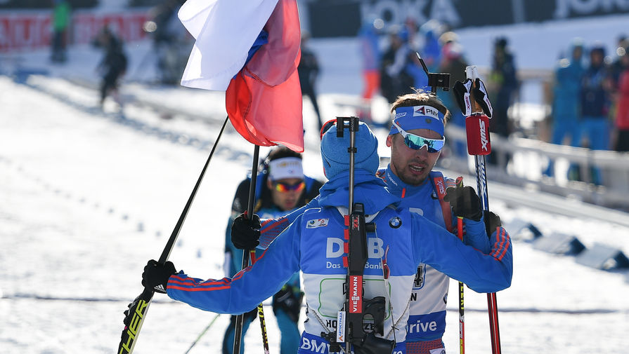 Максим Цветков (Россия) (на первом плане) и Антон Шипулин (Россия) после победного финиша эстафеты среди мужчин на чемпионате мира по биатлону в австрийском Хохфильцене. На заднем плане французский биатлонист Мартен Фуркад, чья команда выиграла серебро