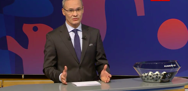 Ведущий жеребьевки Педру Пинту вышел на сцену в одном из залов штаб-квартиры УЕФА в швейцарском Ньоне! Мероприятие вот-вот начнется!
