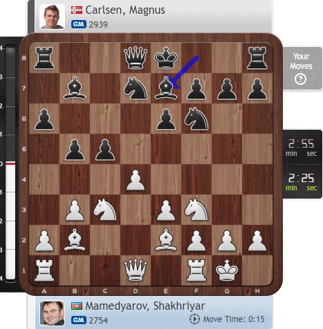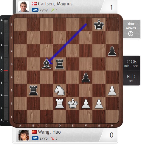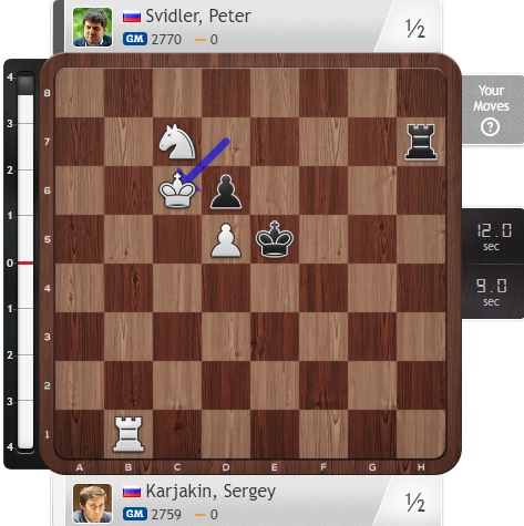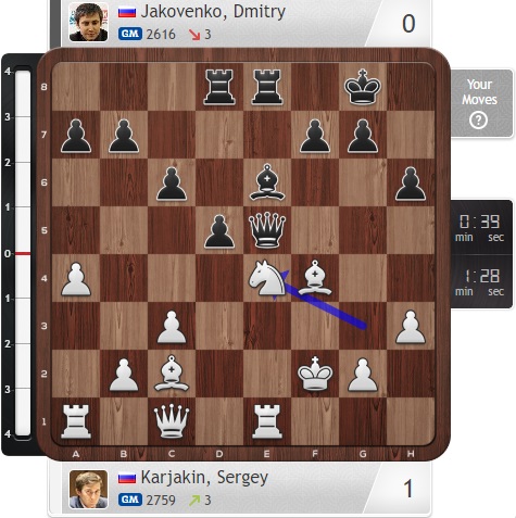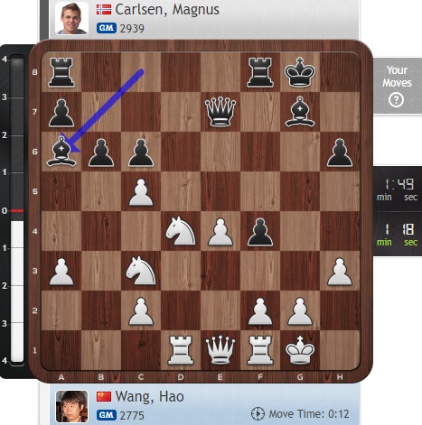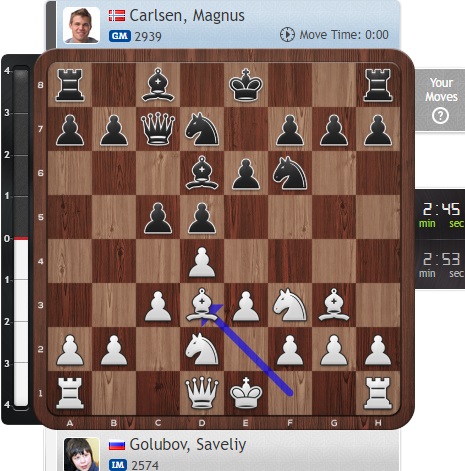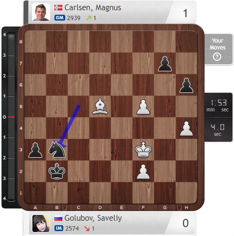Похожим образом действуют Голубов и Карлсен сейчас, при этом опасный черный слон на b7 у норвежского чемпиона давит на белого коня...