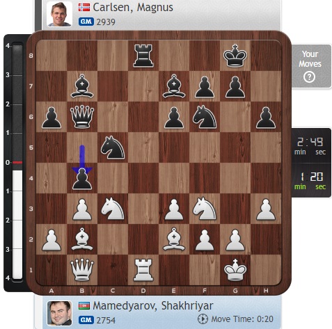 Размены пошли... Вряд ли дождемся мы в этой партии агрессивной игры на победу. И Карлсен, и Мамедьяров осторожничают.