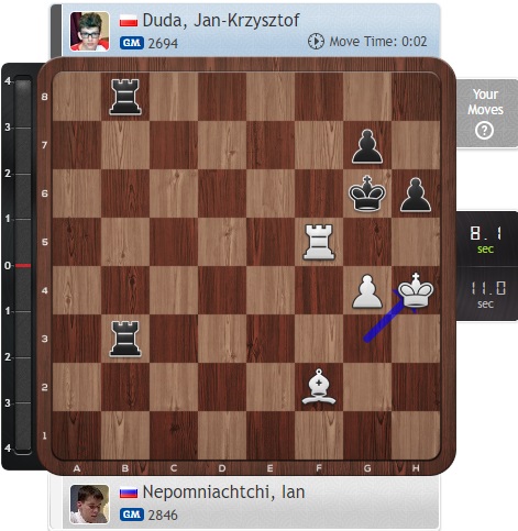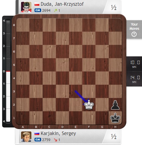 Фантастическая партия! Очень много возможностей было у Карякина, позиция была почти выигранной, даже зевок ладьи не мешал ему, но в конечном счете вообще пришлось спасаться. Ничья, которой Дуда очень доволен!