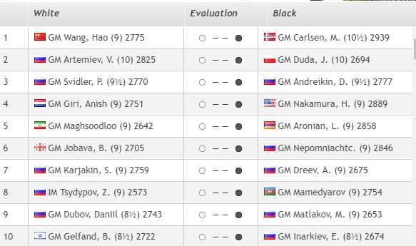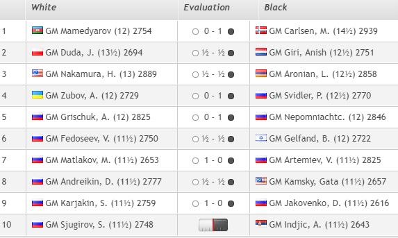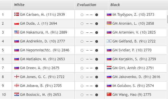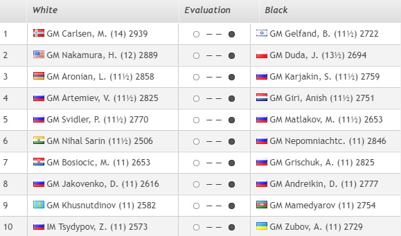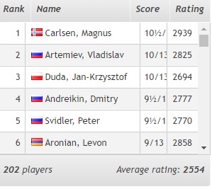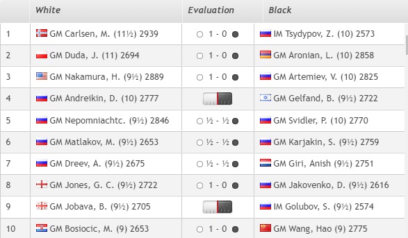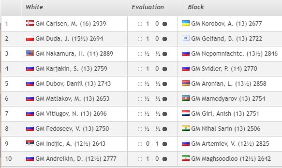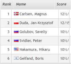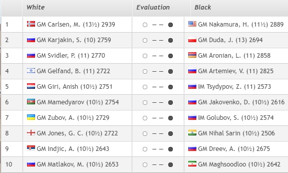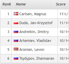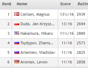 1. Карлсен (Норвегия) — 14 очков. 2. Дуда (Польша)— 13,5 3. Накамура (США) — 12 4. Артемьев, Свидлер, Аронян, Карякин, Матлаков (все — Россия), Гири (Нидерланды), Нихал Сарин (Индия), Гельфанд (Израиль) — 11,5