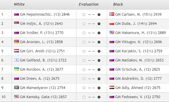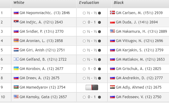 Итак, Карлсена попробует остановить Непомнящий, Дуда черными сыграет с сербом Инджичем. Ну и «партия за бронзу» между Накамурой и Свидлером!