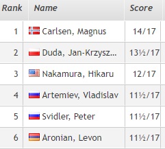 1. Карлсен (Норвегия) — 14,5 очков 2. Дуда (Польша) — 13,5 3. Накамура (США) — 13 4. Аронян (Армения), Свидлер (Россия), Гири (Нидерланды) — 12,5 7. Непомнящий, Грищук (оба — Россия), Мамедьяров (Азербайджан), Гельфанд (Израиль), Зубов (Украина) — 12.