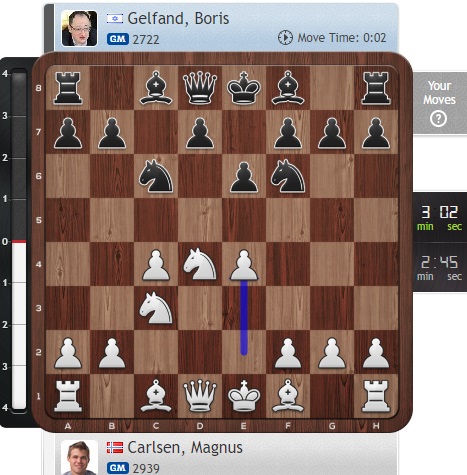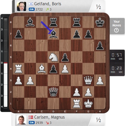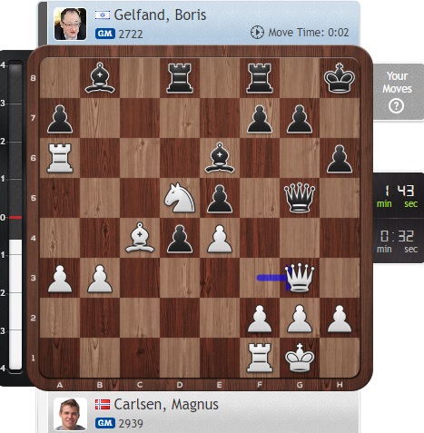 Ну а Карлсен играет вничью с Гельфандом, что только улучшает его положение во главе таблицы!