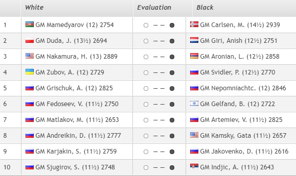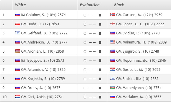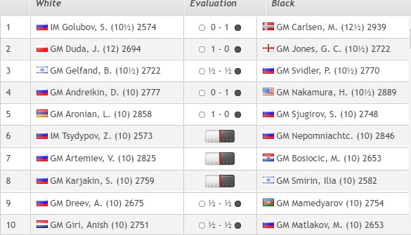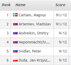1. Карлсен — 11,5 очков 2. Дуда — 11 очков 3. Андрейкин, Артемьев, Цыдыпов, Свидлер (все — Россия), Аронян (Армения) — 10.