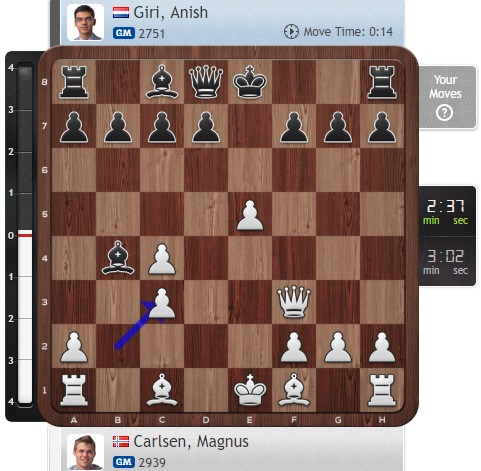 Очень интересную заготовку предложил Карлсен, и очевидно, что Гири приходится искать решения прямо за доской!