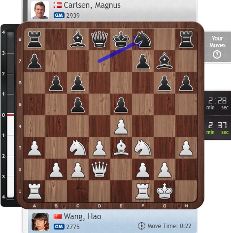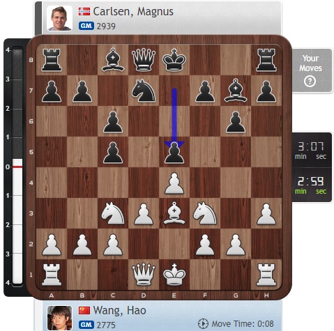 Карлсен в отличной форме, а вот Ван задумывается, хотя на доске вполне стандартный вариант сейчас.