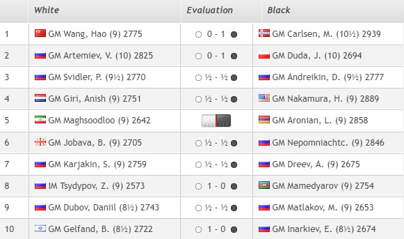Карлсен становится единоличным лидером, Артемьев и Дуда за ним с отставанием в полочка.
